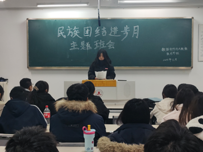 各班班会以“石榴花开映初心,团结奋进新征程”“根系中华沃土,共绘团结画卷“一脉同心聚星河,携手奋进新征程》《筑牢精神纽带,绽放团结之花》为主题,各班级结合专业特色与学生实际,精心策划活动内容。有的班级通过播放民族团结主题纪录片、展示各民族风俗文化图片,带领学生感受中华文化的多元一体;有的班级邀请少数民族学生代表分享家乡发展故事,以“身边事”诠释“团结情”;还有的班级开展“民族团结知识竞答”“中华文化符号拼图”等互动环节,在趣味中深化认知。班长戚慧冉、张雅丽表示:“班会不是单向灌输,而是通过沉浸式体验让学生成为主角,真正让民族团结的种子扎根心田。”