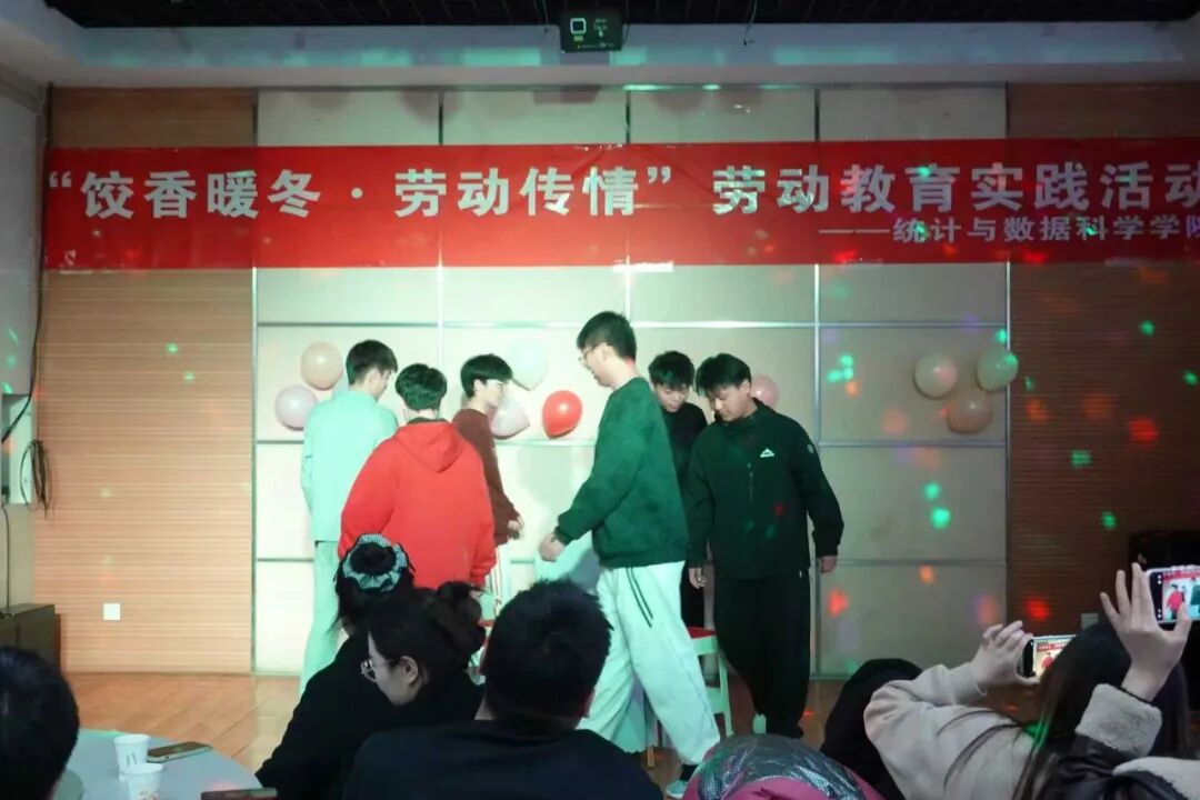等待饺子出锅的间隙,大家欣赏了2025级应用统计学班的贾子衿同学演唱的歌曲《她说》、学院舞蹈队带来的《舞蹈串烧》。随后,进行的“抢凳子”游戏将现场的气氛推向了高潮,大家积极参与,充满一片欢声笑语。在轻松愉悦的氛围中,同学们品尝着自己包的饺子,感受着劳动带来的快乐。