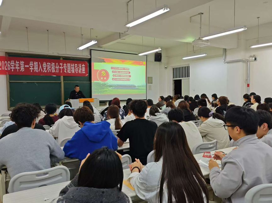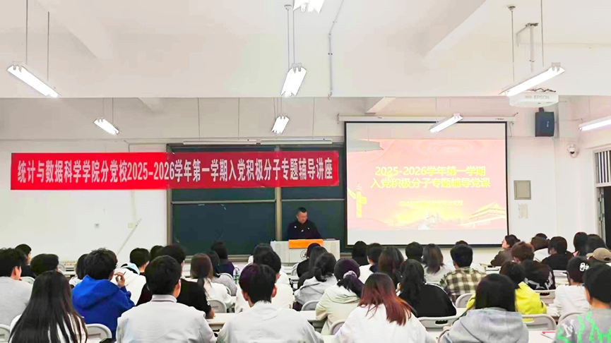 为进一步加强对入党积极分子的培养教育,切实提高学员的思想政治素质和理论修养,9月29日晚19:00,统计与数据科学学院2025—2026学年第一学期入党积极分子专题辅导在博学楼103举行。学院党委书记刘广场作专题辅导,75名入党积极分子参加培训。