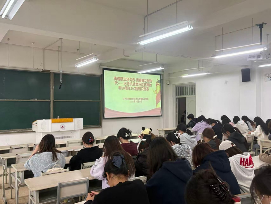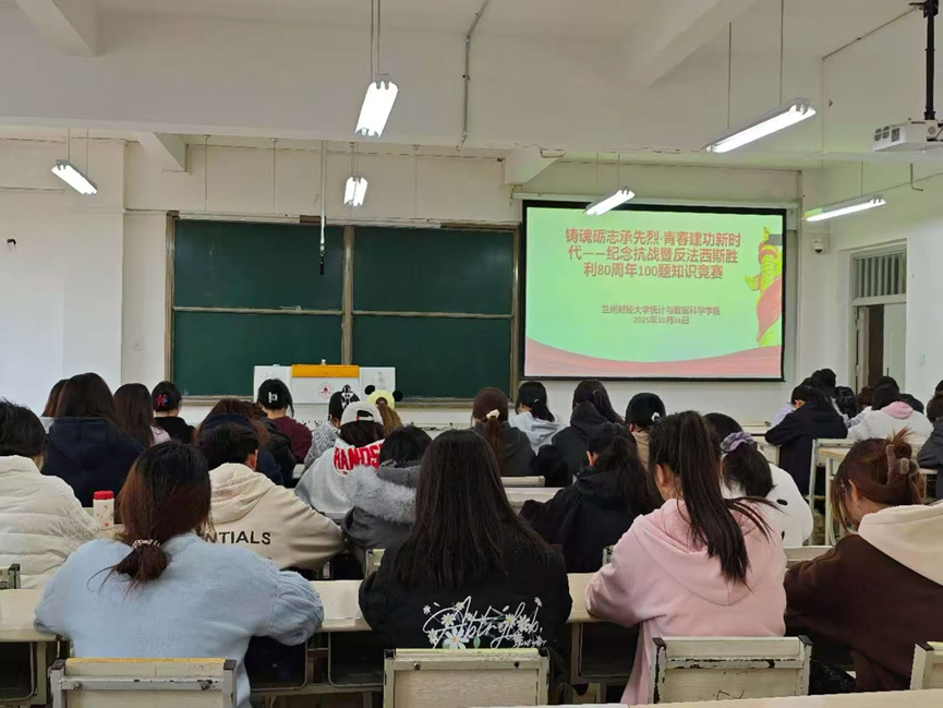 为深切缅怀抗战先烈、传承伟大抗战精神,在纪念中国人民抗日战争暨世界反法西斯战争胜利80周年之际,10月24日下午19:00,统计与数据科学学院各党支部以“铸魂励志承先烈·青春建功新时代”为主题,组织开展了纪念抗战暨反法西斯胜利80周年知识竞赛,全体学生积极参与。